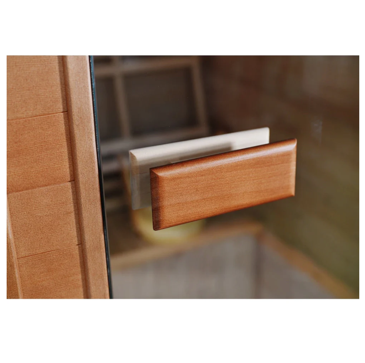 The Waverly 3-person outdoor sauna is designed for traditional use. It has a shingled roof for outdoor setup and front windows that let in extra light. The sauna features a strong 4.5 kW electric Harvia heater. It uses lava rocks and can get as hot as 170 degrees. The Waverly features a Bluetooth speaker system, a sand timer, and a hygrometer. It also includes a cask and spoon for adding water to the lava stones. A 55-inch rear bench seat provides ample room for 3.